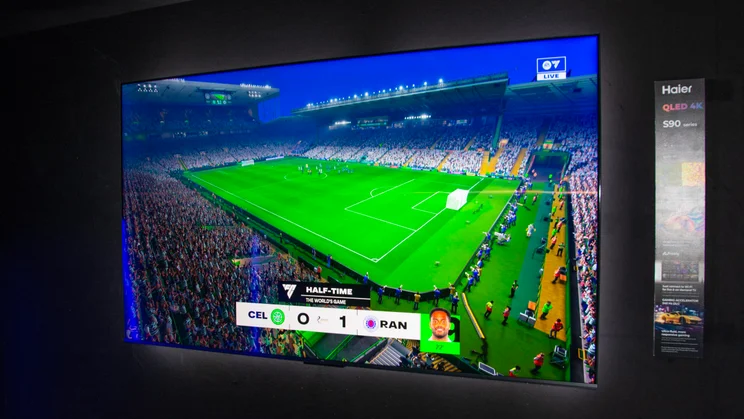 Also sporting a quantum-dot powered LED panel, but this time with various welcome extras, the S90 is the most advanced of the televisions Haier showed off at Anfield. This one starts at 55in and has three larger sizes available – 65in, 75in and 85in – all of which support Dolby Atmos and Sound by KEF. This is also the point in the lineup where we see Homey AI used. Refresh rates of up to 144Hz with VRR are supported here, too, with those refresh rates rising to 240Hz with DLG gaming acceleration enabled.